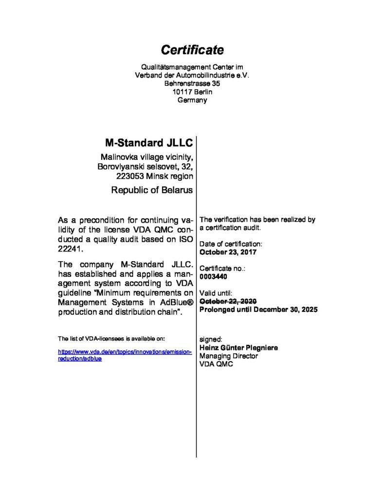 Сертификат* соответствия системы менеджмента СООО «М-Стандарт» требованиям Verband der Automobilindustrie e.V. (VDA) для лицензионного производства AdBlue® * Действие сертификата пролонгировано по 2025.06.30. Список лицензиатов регулярно публикуется и обновляется на веб-сайте VDA.
